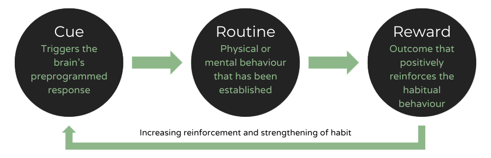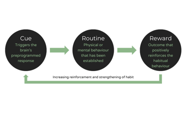 Note that the cue in this process does is not necessarily obvious or grand. It can be as simple as sitting in a particular chair in your house, a certain time of day or a naturally occurring emotion. Whatever it is, it will trigger you to undertake a certain 'routine', which is the habitual behaviour itself.